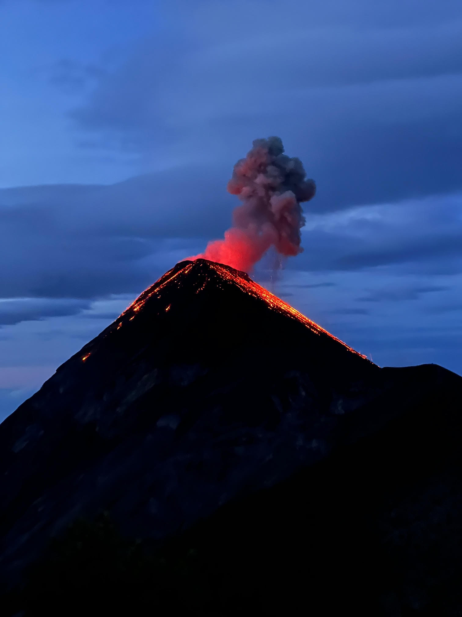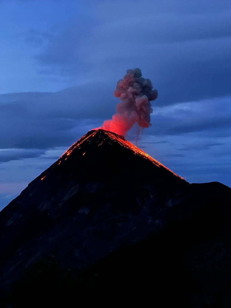 Not long after the hikers left, we heard a loud “thunder” and we saw Fuego erupt in beautiful lava! I did not have my phone handy but it was a beautiful sight! Realizing the fog had cleared and we would be privy to more shows, we decided to sit out and watch, this time with phones in hand. We were patient (the eruptions happened about twenty minutes apart and some bigger than others) and got to see some nice eruptions from Fuego. This made me feel better about staying because it was unknown whether the other hikers would be able to see them from the summit, but we were definitely seeing it here! To celebrate, Denis and I popped our beers at 6:00 a.m….hey, no judging! LOL
